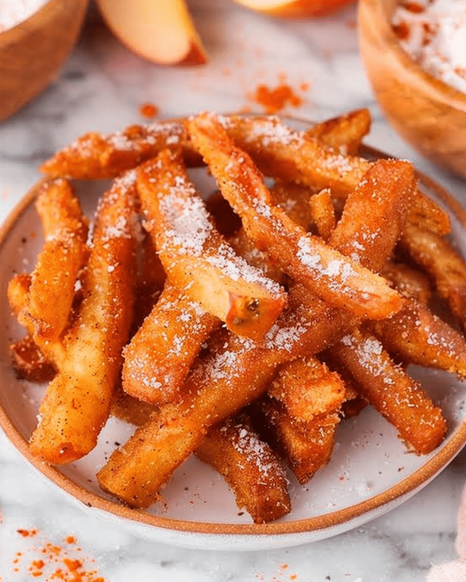 Crispy, golden, cinnamon-sugar-coated apple fries made effortlessly in the air fryer. A lighter sweet treat perfect for snacking or dessert, with a deep-fried texture and classic apple pie flavor.