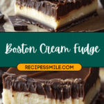 A rich and creamy no-bake fudge inspired by Boston cream pie, featuring a smooth vanilla base, cocoa swirls, and a glossy chocolate topping.