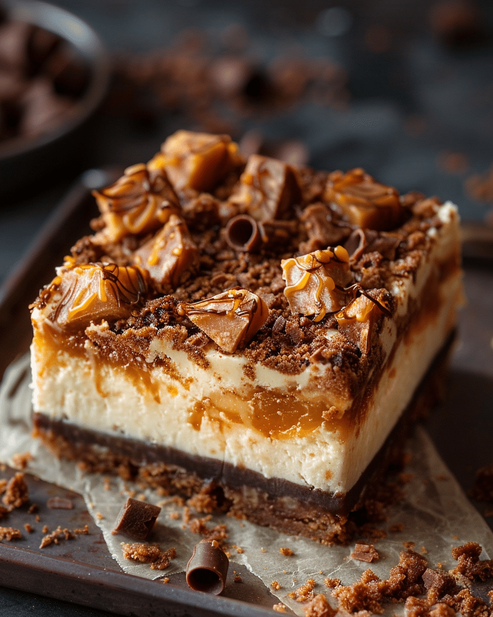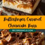 These Butterfinger Caramel Cheesecake Bars are a rich, no-bake dessert with a buttery graham cracker crust, silky caramel cream cheese filling, and a crunchy Butterfinger topping. Each bite is smooth, sweet, and perfectly indulgent.