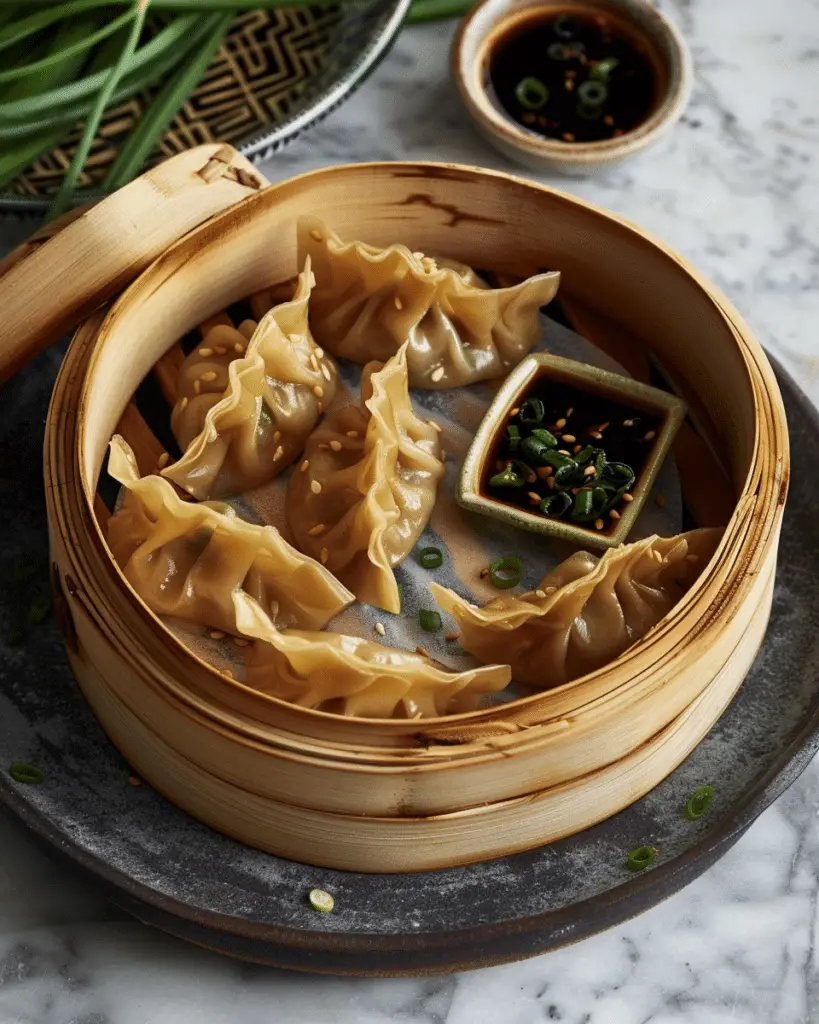 Steamed Vegetable Dumplings with Savory Soy Dipping Sauce
