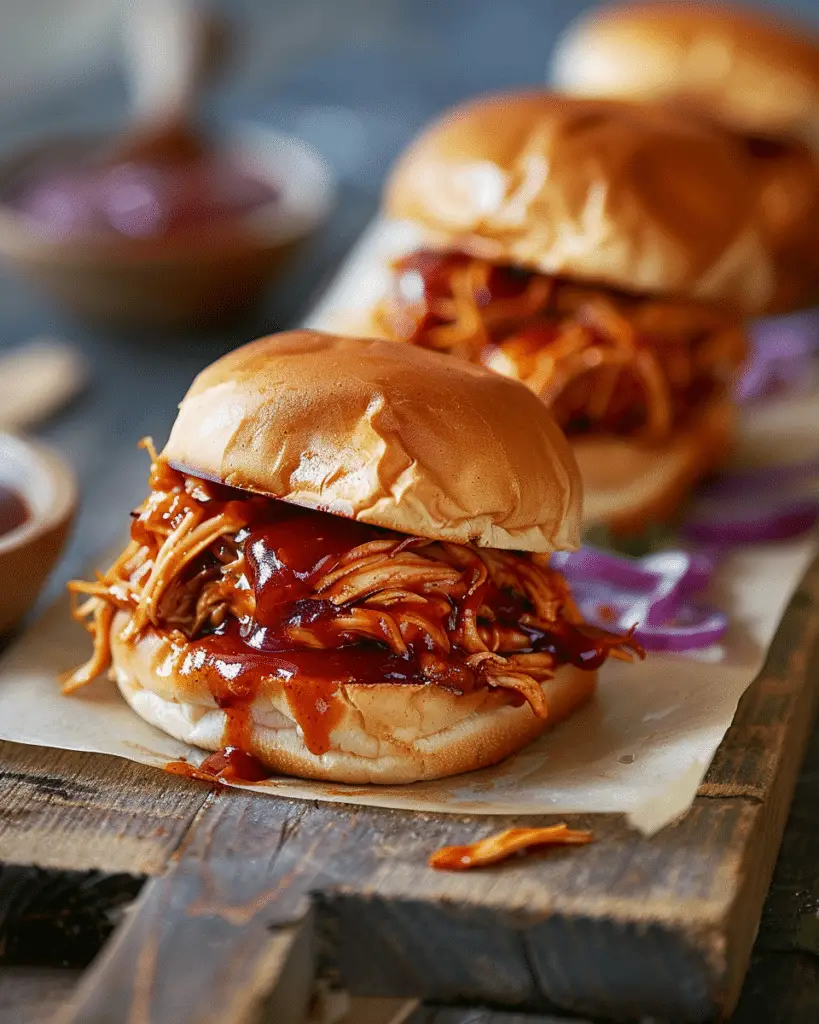 Tender shredded chicken coated in tangy BBQ sauce, served on toasted slider buns with a crunchy slaw – these BBQ …