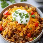 I love how everything cooks in one pan, which makes cleanup simple and stress-free. The taco seasoning gives the rice and meat a bold, savory flavor, while the melted cheese brings everything together in a creamy, comforting way. I can easily customize it with different proteins, extra vegetables, or spicy additions depending on what I have on hand. It is also perfect for feeding a family or meal prepping for the week.