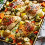 A comforting one-pan meal featuring juicy chicken, roasted vegetables, and a creamy, cheesy ranch sauce—all cooked together on a single sheet pan for easy cleanup and a satisfying dinner in under an hour.