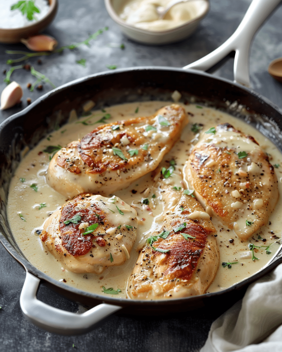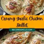 This creamy garlic chicken skillet is a comforting one-pan meal featuring golden-seared chicken thighs simmered in a rich garlic and thyme-infused cream sauce. It’s easy, flavorful, and perfect for pairing with mashed potatoes, pasta, or rice.
