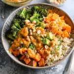 A wholesome and colorful plant-based bowl featuring roasted sweet potatoes, crisp veggies, fluffy rice, and a creamy Thai peanut sauce. Perfect for weeknight dinners or meal prep.