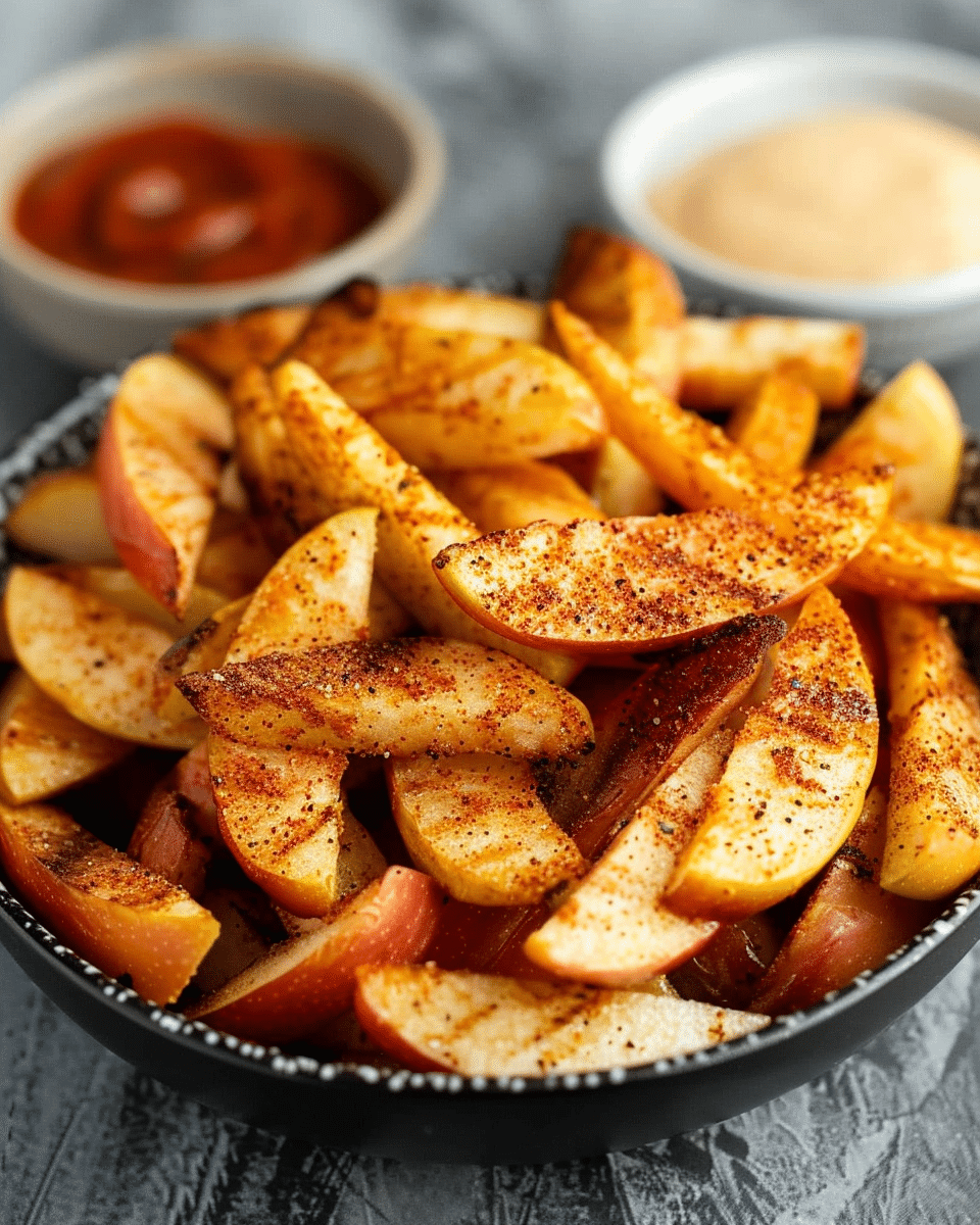 These apple fries are best served fresh, but if I have leftovers, I store them in an airtight container in the fridge for up to 2 days. To reheat, I pop them back in the air fryer at 350°F (175°C) for 3–4 minutes to bring back the crispiness. I avoid using the microwave, as it tends to make them soggy.