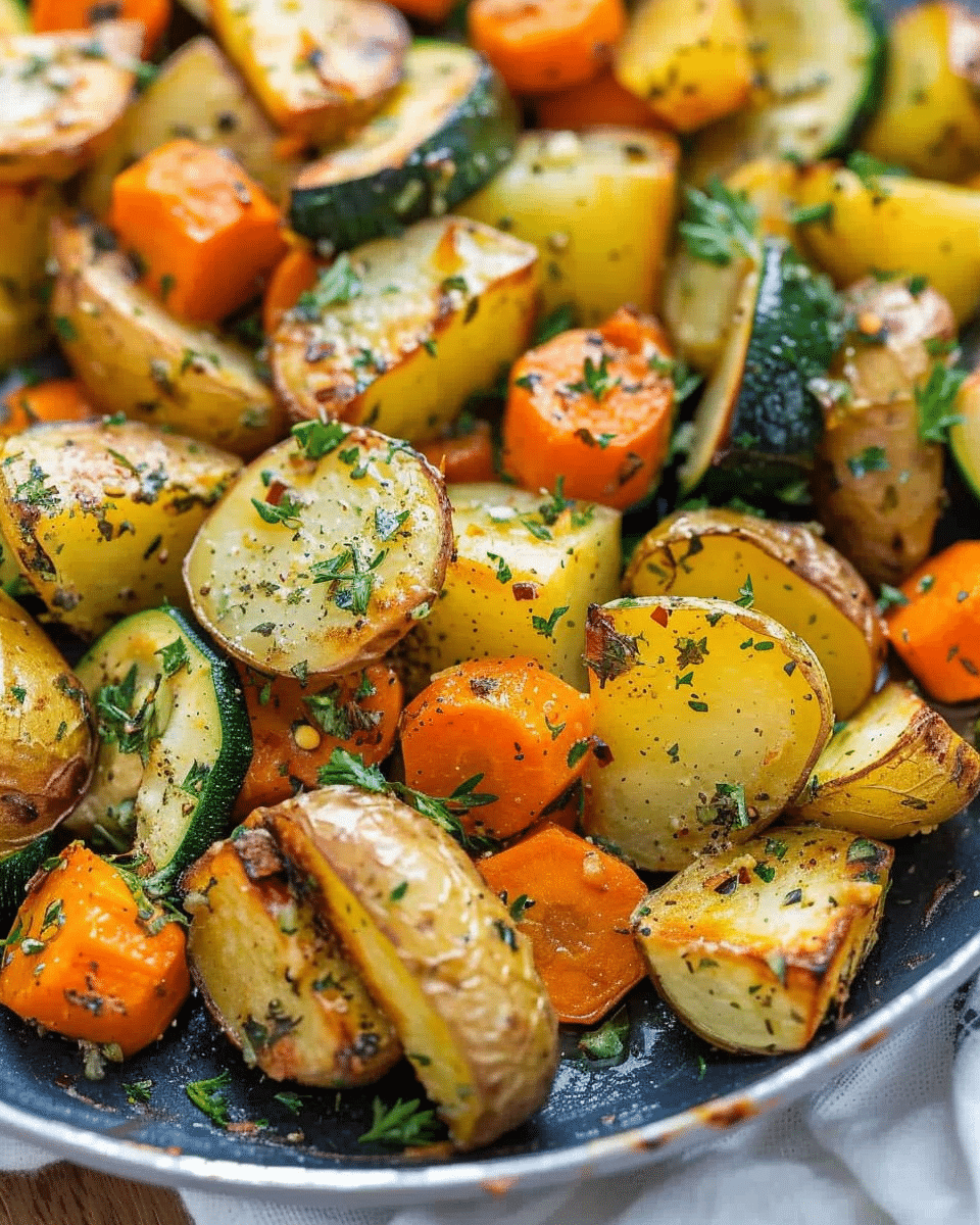 Crispy Garlic Herb Roasted Potatoes Carrots, and Zucchini