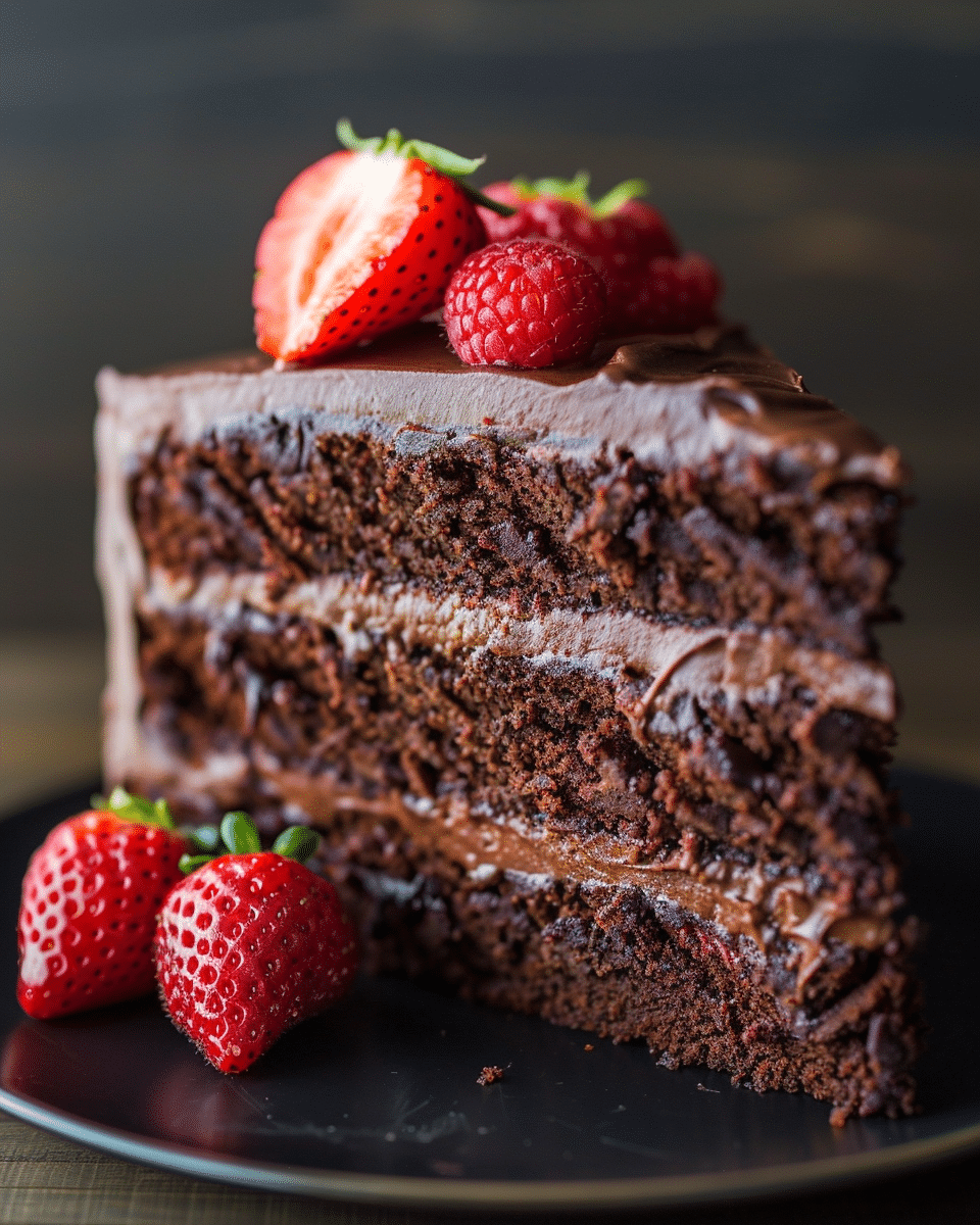 A rich, moist, and deeply chocolatey cake layered with fresh strawberries and silky dark chocolate frosting, perfect for celebrations and special occasions.