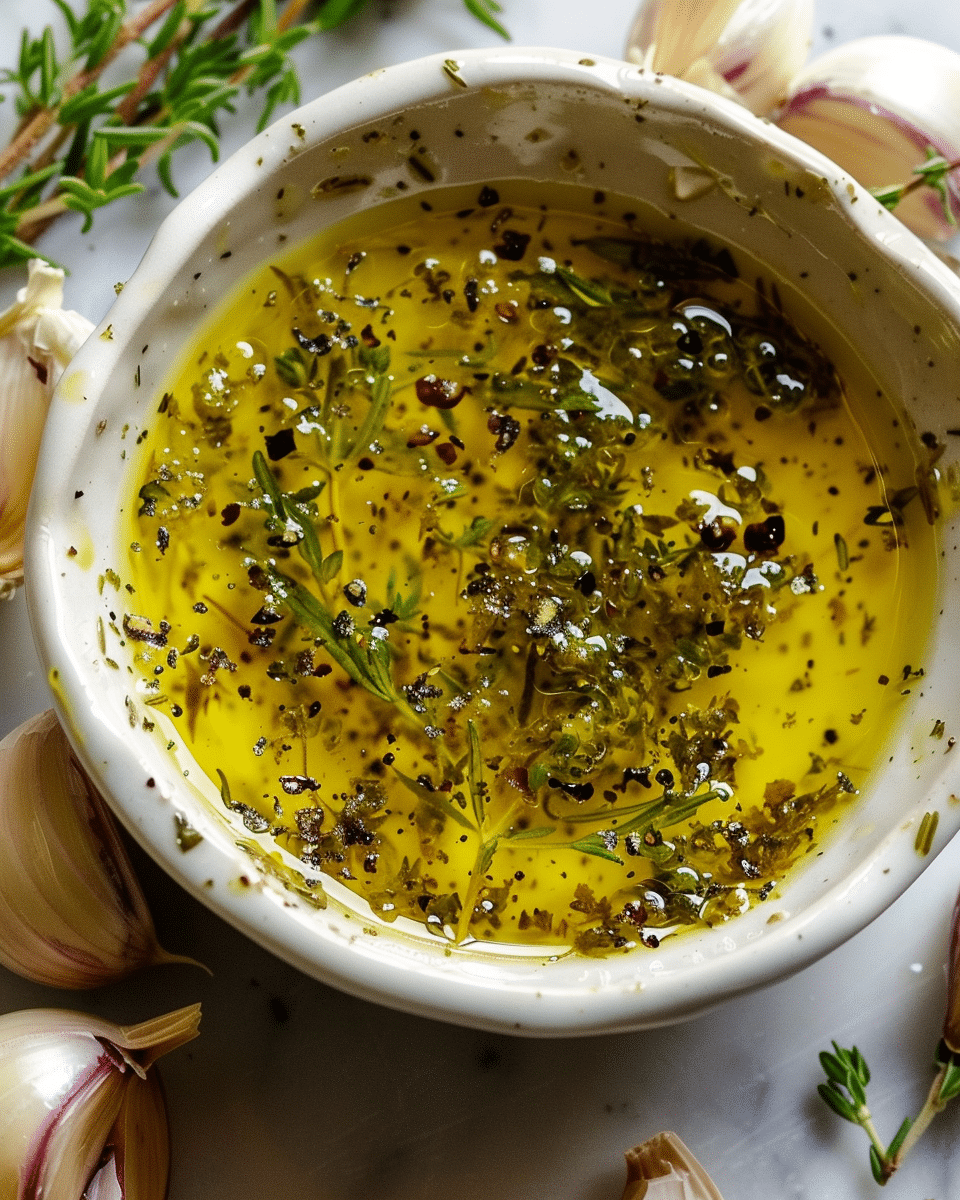 A simple yet bold Garlic Olive Oil Dip made with sweet roasted garlic, extra virgin olive oil, fragrant herbs, and a hint of lemon—perfect for dipping warm crusty bread or serving as a flavorful appetizer.
