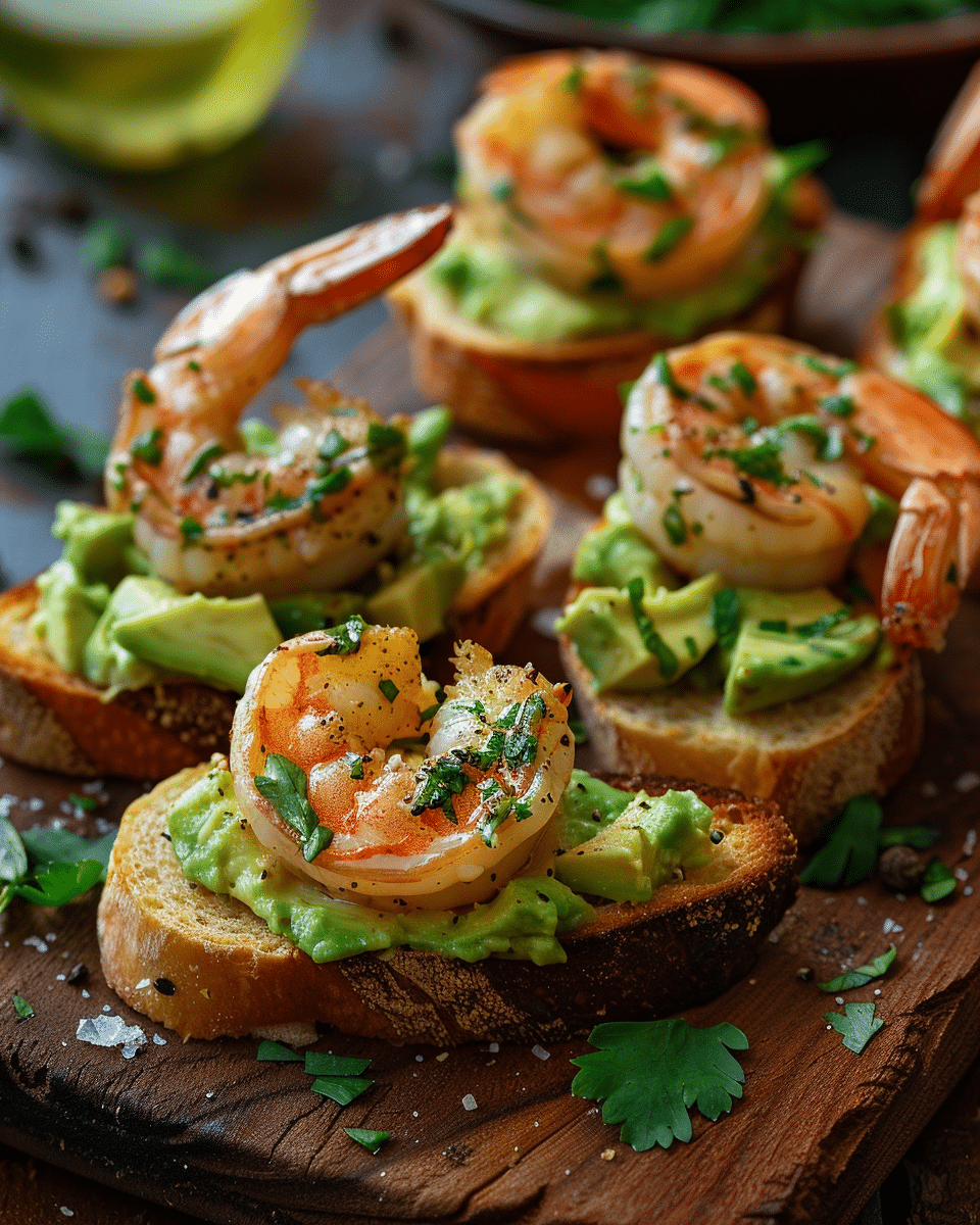 Crispy toasted baguette slices topped with creamy avocado and juicy garlic butter shrimp, creating a vibrant and elegant appetizer full of fresh, savory flavor.