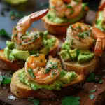 Crispy toasted baguette slices topped with creamy avocado and juicy garlic butter shrimp, creating a vibrant and elegant appetizer full of fresh, savory flavor.