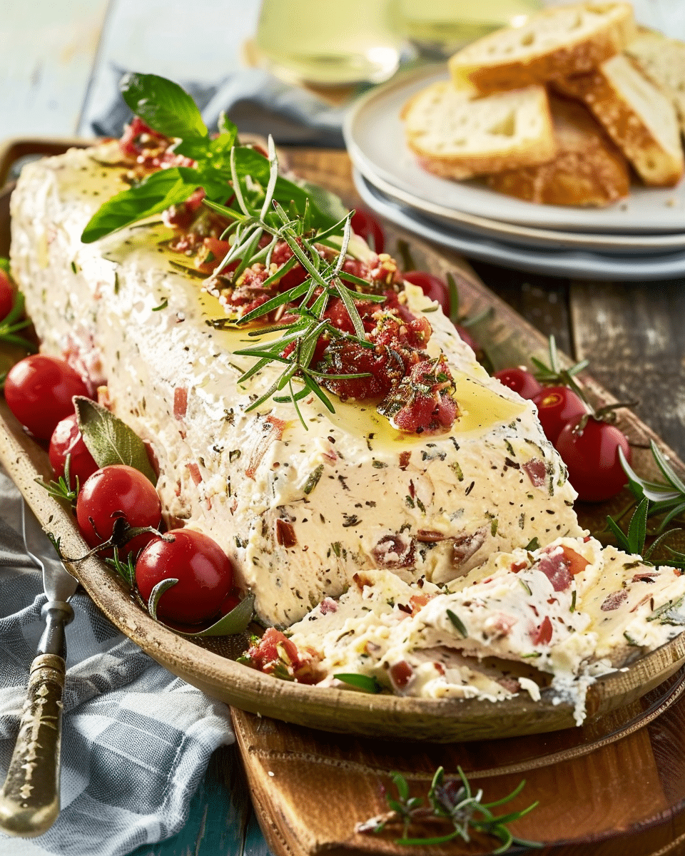 - Transfer the log to a serving plate, garnish with fresh herbs, and serve with crackers, crostini, or sliced baguette.