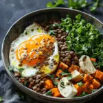 A hearty and nourishing breakfast bowl featuring warmly spiced lentils, roasted sweet potatoes, soft-boiled eggs, and a creamy tahini drizzle. This balanced savory bowl delivers protein, fiber, and comforting flavor to start the day.