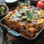 A hearty and comforting Mexican lasagna layered with seasoned beef, tortillas, beans, salsa, and melted cheese. This crowd-pleasing casserole blends bold flavors with a classic baked dish feel.