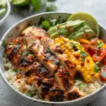 Smoky Street Corn Chicken Bowls feature chili-lime spiced chicken served over fluffy rice with creamy street corn, fresh avocado, and vibrant toppings for a bold, satisfying, and colorful meal.
