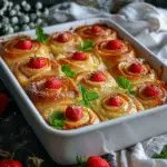 - Roll tightly from the long edge into a log and slice into 9–12 rolls. Place in a greased baking dish.