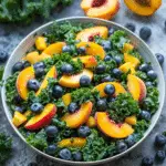 A bright and refreshing summer salad featuring tender kale, juicy peaches, sweet blueberries, and crunchy toasted pepitas tossed in a zesty honey-lemon vinaigrette.