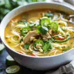 A cozy Thai-inspired soup made with tender shredded chicken, colorful vegetables, zucchini noodles, and a creamy coconut curry broth. It is light, flavorful, and perfect for a quick and nourishing weeknight meal.