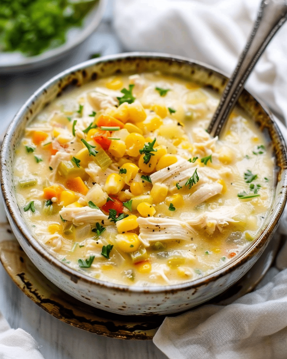 A rich and creamy slow-cooked chowder packed with tender chicken, sweet corn, potatoes, and flavorful spices — the perfect cozy meal for chilly days or busy weeks.